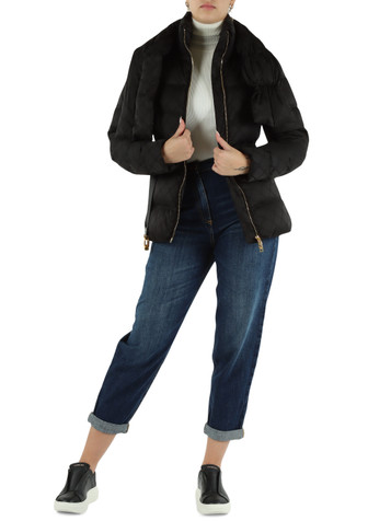 Scegli opzioni ELISABETTA FRANCHI Giubbotto trapuntato cropped in tessuto tecnico Altezza della modella (cm): 175Taglia indossata: 40collo altomaniche lunghechiusura con zip a due vie e tirazip logotasche frontali con zippatch logo sulla manicafondo elasticizzatocollo e fondo a... MSRP: €450,00