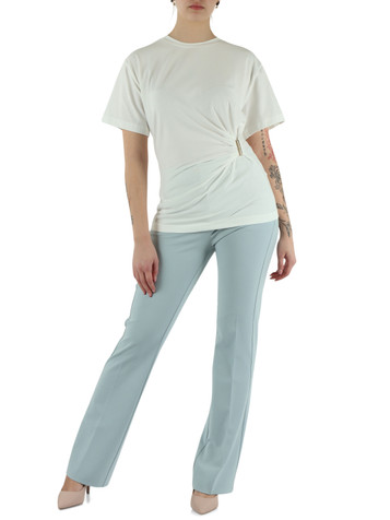 Chiusura con bottone gancetto e zip a scomparsatasche frontalitasche a filo sul retrocatena decorativa rimovibilepinces frontaliMade in ItalyAltezza della modella (cm): 175Taglia indossata: 40cavallo (cm): 38lunghezza della gamba (cm): 6,5fondo (cm):...