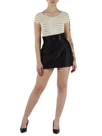 Scegli opzioni ELISABETTA FRANCHI Minigonna vita alta in doppio crepe Altezza della modella (cm): 175Taglia indossata: 42chiusura con zip a scomparsa sul retroplacca logo frontaleinserti in tessuto elasticizzatovita altafoderataMade in Italy96%POLYESTER4%ELASTANE MSRP: €320,00