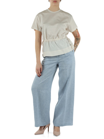 Scegli opzioni PESERICO T-shirt in lino e cotone con inserto in seta Altezza della modella (cm): 175Taglia indossata: 40girocollomaniche corte con risvolti cucitichiusura a goccia con bottonedettagli in metallo finitura argentoinserti in setaMade in Italy50%LINEN50%COTTON/94%SILK6%ELASTANE MSRP: €325,00